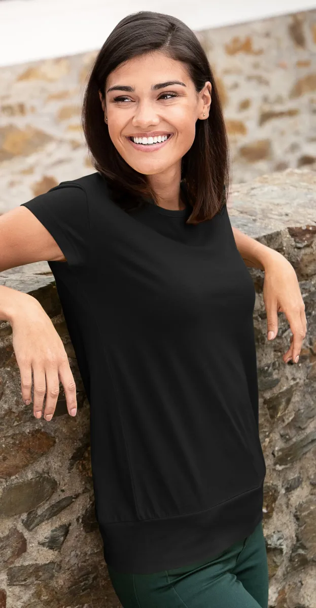 Női könnyebb, bő szabású pamut póló, rövid ujjú, kerek nyakkivágással és széles alsó szegéllyel. Nagyszerű nyári és egész éves viselethez.