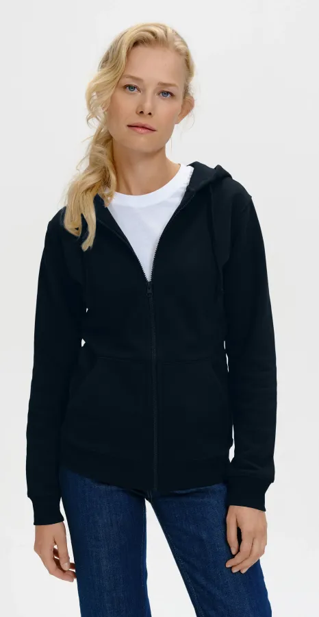 Női pulóver, kenguru stílusú zsebbel az elején, kapucnival és cipzárral.