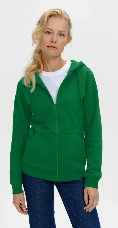 Női pulóver, kenguru stílusú zsebbel az elején, kapucnival és cipzárral.