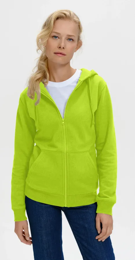 Női pulóver, kenguru stílusú zsebbel az elején, kapucnival és cipzárral.